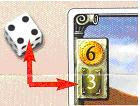 3.Joga a carta “Legat” que tinha biscado, colocando-a junto ao disco “4” . Não precisa de lançar o dado para colocar a carta, apenas tem de pagar o preço que consta da carta. Paga o montante correspondente a 5 moedas, colocando-as na reserva geral.