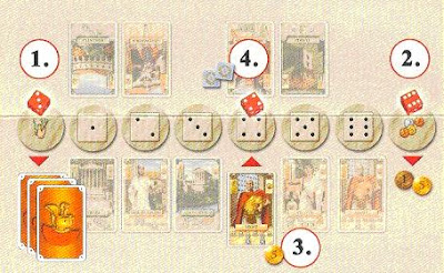 · 3 dados de acção por jogador – são necessários para activar cartas, ganhar dinheiro e biscar cartas;